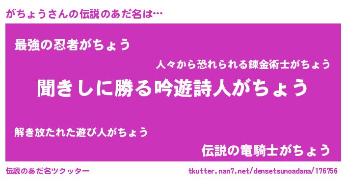 | 男性向けラノベタイトル風あだ名 | 『がちょうという概念が存在しない退屈な世界 』 |