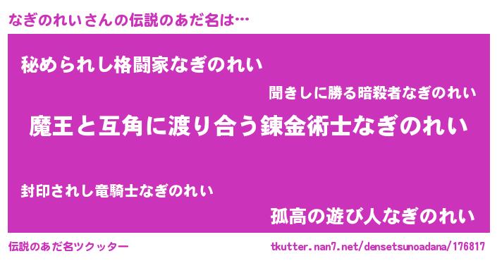 | 男性向けラノベタイトル風あだ名 | 『この素晴らしい世界になぎのれいを!』 |