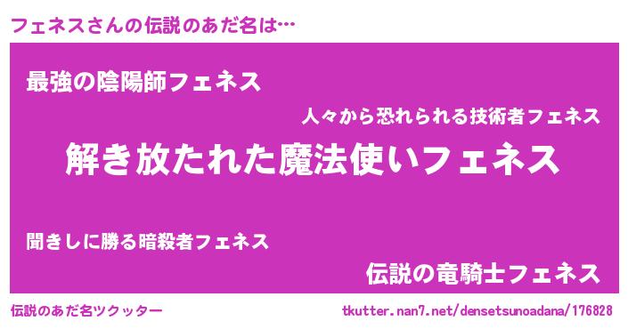 | 男性向けラノベタイトル風あだ名 | 『フェネスの嫁は女の子じゃないと思った?』 |