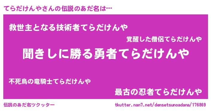 | 男性向けラノベタイトル風あだ名 | 『テラダケンヤスレイヤー』 |
