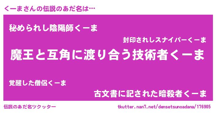 | ヒーロー風カッコイイあだ名 | 『慈愛の使者くーま』『最強戦士クーマ』 |