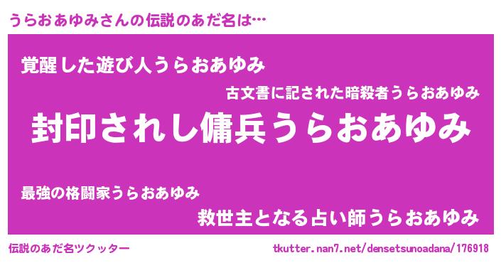 | 意味不明あだ名 | 『住所不定無職うらおあゆみ(50歳)』 |