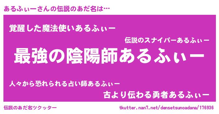 | ファンタジー風あだ名 | 『エターナルアルフィーー』『ゼアルトゥ』 |