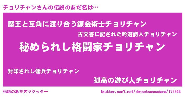| 女子向けラノベタイトル風あだ名 | 『チョリチャンが死なない童話 林檎のチョリチャンの診療簿』 |