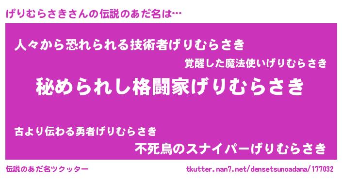| 意味不明あだ名 | 『自称げりむらさき』 |