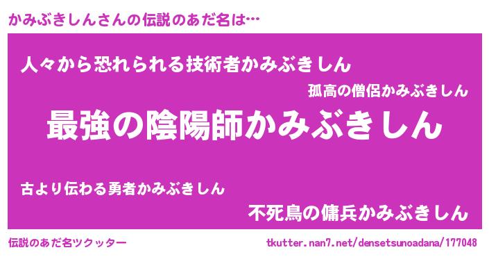 | 男性向けラノベタイトル風あだ名 | 『うちのかみぶきしんが世界を掌握している!』 |