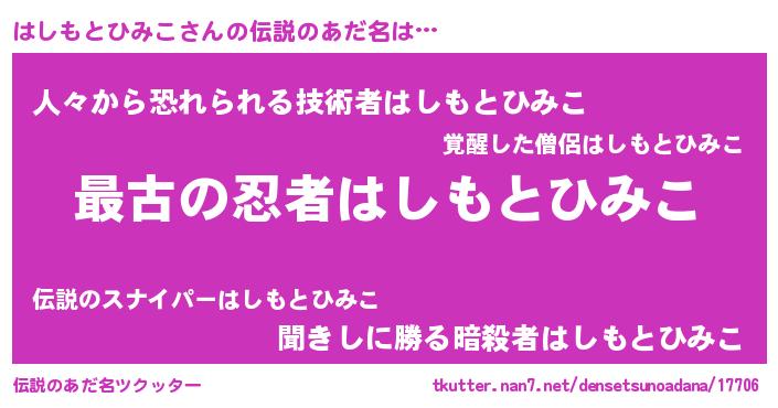 | 男性向けラノベタイトル風あだ名 | 『やはりはしもとひみこの青春ラブコメはまちがっている 』 |