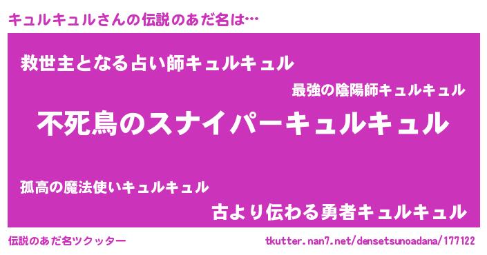 | ヒーロー風カッコイイあだ名 | 『スーパーキュルキュル』『仮面キュダー』 |