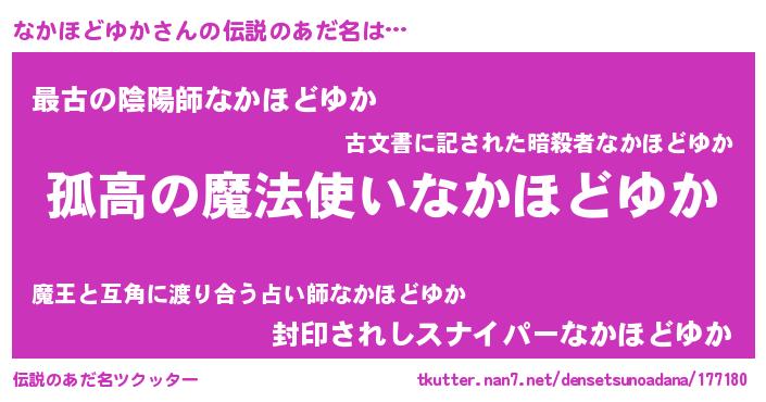 | 胡散臭い通販商品みたいなあだ名 | 『信頼と実績のサプリメント…その名も「なかほどゆか」』 |