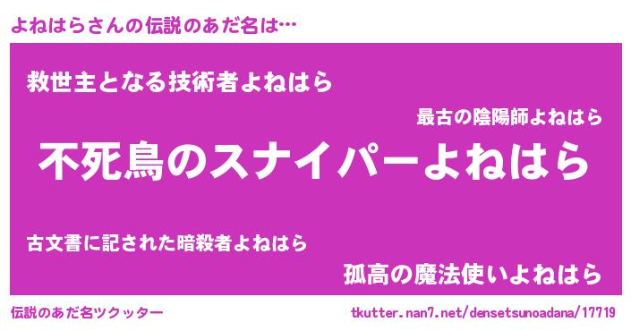 | 男性向けラノベタイトル風あだ名 | 『Re:よねはらから始める異世界生活』 |