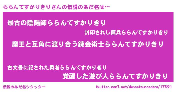 | 男性向けラノベタイトル風あだ名 | 『転生したらららんてすかりきりだった件』 |