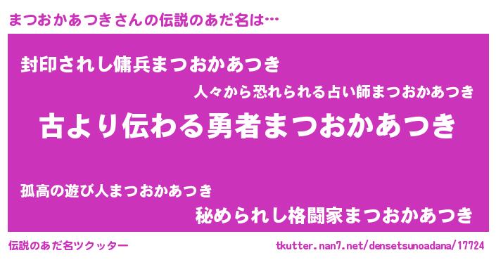 | 男性向けラノベタイトル風あだ名 | 『転生したらまつおかあつきだった件』 |