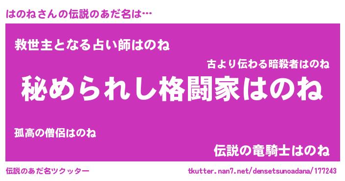 | 意味不明あだ名 | 『はのねフォーエバー』『自称はのね』 |