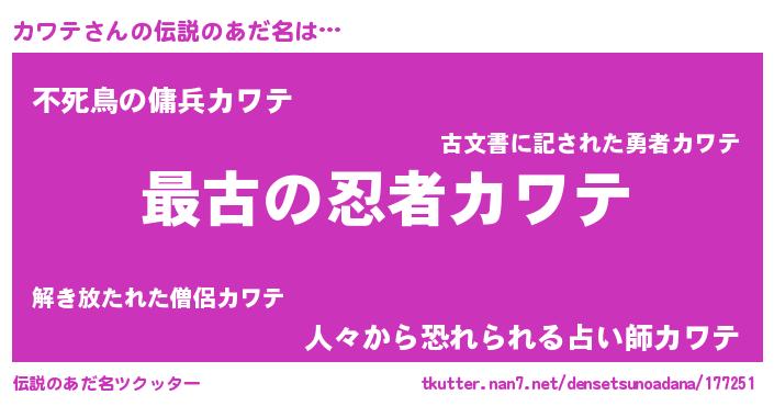 | ヒーロー風カッコイイあだ名 | 『ウルトラカワテマン』『究極戦士カワテ』 |