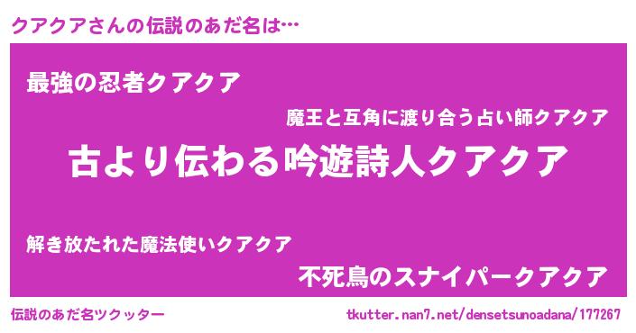 | 意味不明あだ名 | 『永久保存クアクア』『自称クアクア』 |