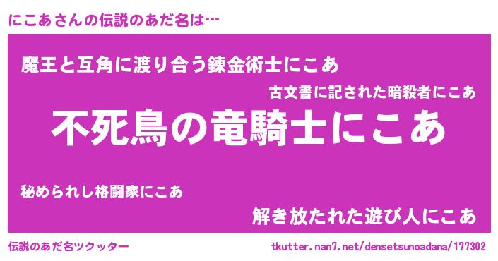 | ヒーロー風カッコイイあだ名 | 『スーパーニコア』『正義の使者にこあ』 |