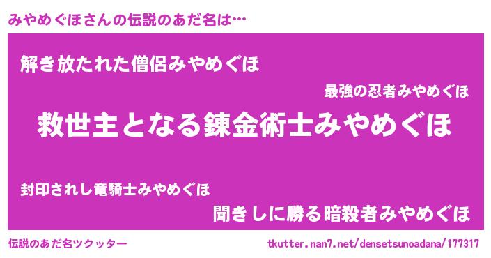 | ヒーロー風カッコイイあだ名 | 『慈愛の使者みやめぐほ』『幻影騎士ミヤ』 |