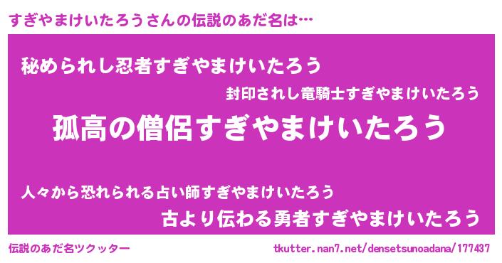 | 男性向けラノベタイトル風あだ名 | 『魔弾の王とすぎやまけいたろう』 |