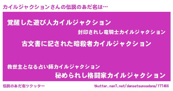 | 胡散臭い通販商品みたいなあだ名 | 『前代未聞の健康食品…その名も「カイルジャクション」』 |
