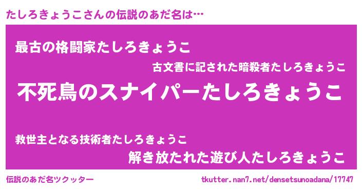 | 女子向けラノベタイトル風あだ名 | 『たしろきょうこ姫と円卓の騎士』 |