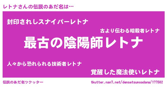 | 男性向けラノベタイトル風あだ名 | 『レトナに滅ぼされるだけの簡単なお仕事です』 |