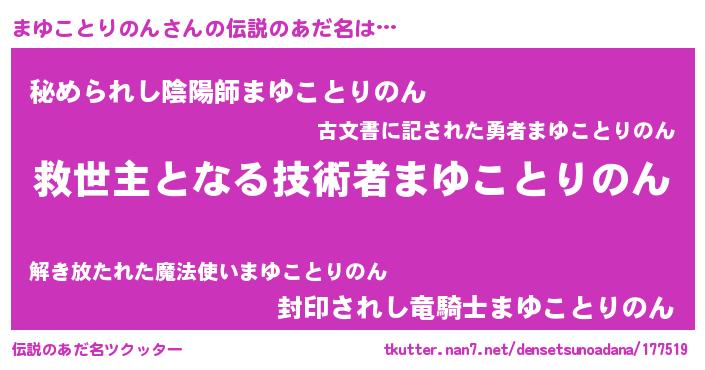 | 胡散臭い通販商品みたいなあだ名 | 『あなたにだけ特別に提供する100年もののヴィンテージワイン…その名も「まゆことりのん」』 |