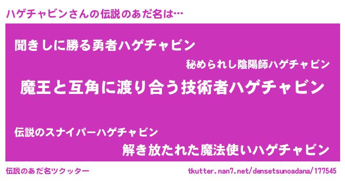 | ヘコむあだ名 | 『ハゲチャビン(小並感)』『ハゲお』 |