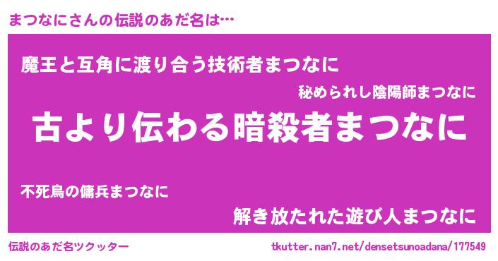 | 男性向けラノベタイトル風あだ名 | 『転生したらまつなにだった件』 |