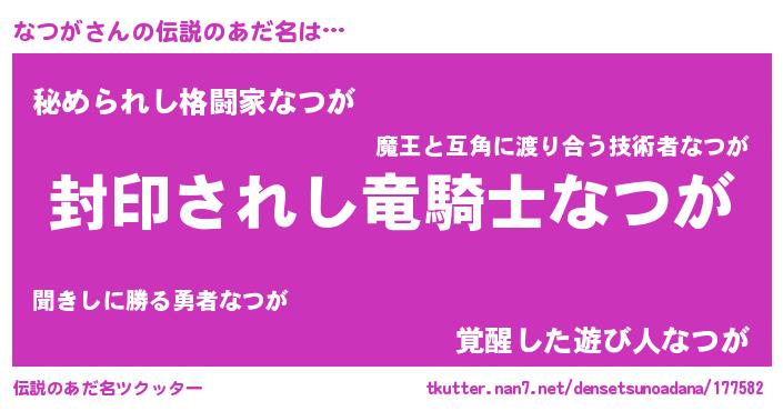 | 男性向けラノベタイトル風あだ名 | 『Re:なつがから始める異世界生活』 |
