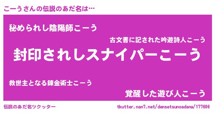 | 男性向けラノベタイトル風あだ名 | 『Re:こーうから始める異世界生活』 |