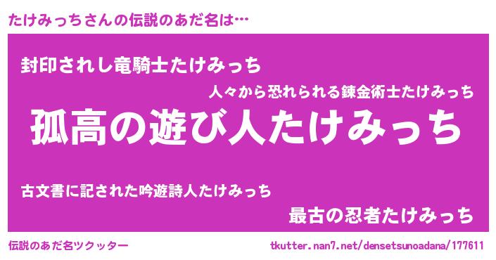 | 男性向けラノベタイトル風あだ名 | 『ダンジョンにたけみっちを求めるのは間違っているだろうか』 |