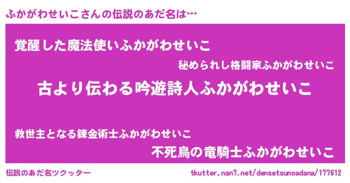 | 男性向けラノベタイトル風あだ名 | 『この素晴らしい世界にふかがわせいこを!』 |