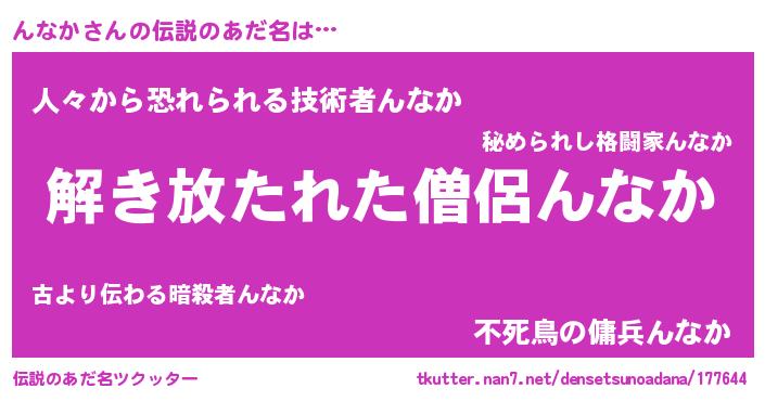 | 意味不明あだ名 | 『なめこ科んなか属』『自称んなか』 |
