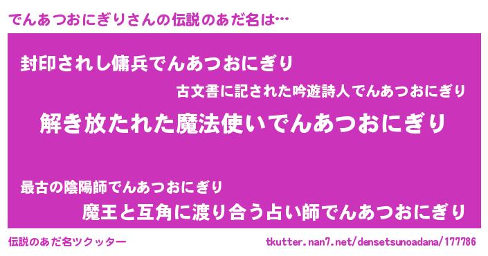 | ヒーロー風カッコイイあだ名 | 『魔戒騎士デン』『ネオデンアツオニギリ』 |