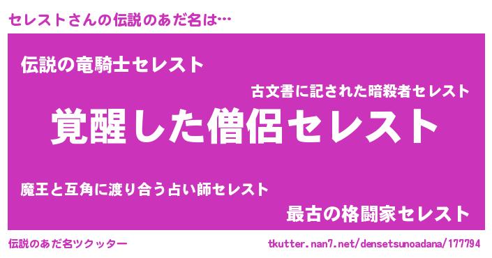 | 男性向けラノベタイトル風あだ名 | 『セレストの嫁は女の子じゃないと思った?』 |