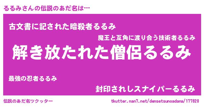 | 女子向けラノベタイトル風あだ名 | 『るるみの卵を拾いまして』 |