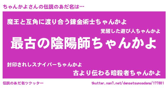 | 意味不明あだ名 | 『自称ちゃんかよ』『永久保存ちゃんかよ』 |