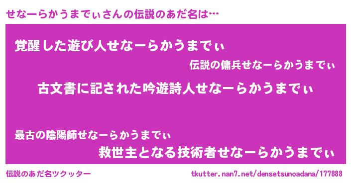 | 胡散臭い通販商品みたいなあだ名 | 『あなたにだけ特別に提供する100年もののヴィンテージワイン…その名も「せなーらかうまでぃ」』 |
