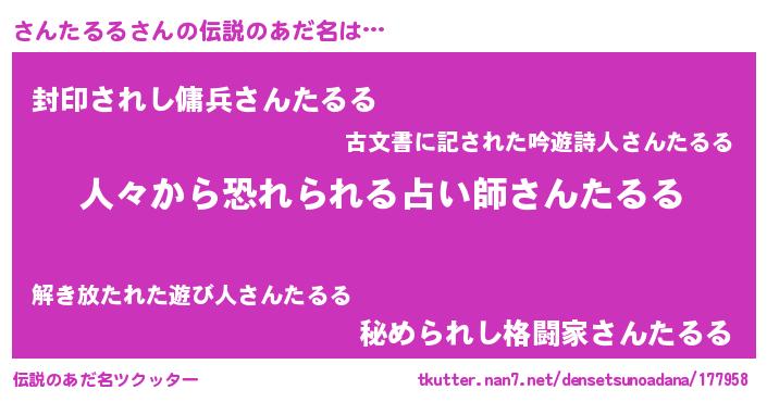 | 女子向けラノベタイトル風あだ名 | 『さんたるるが死なない童話 林檎のさんたるるの診療簿』 |