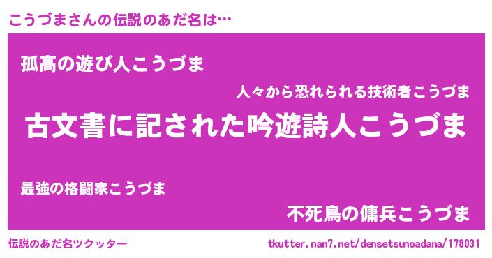 | 意味不明あだ名 | 『自称こうづま』『永久保存こうづま』 |