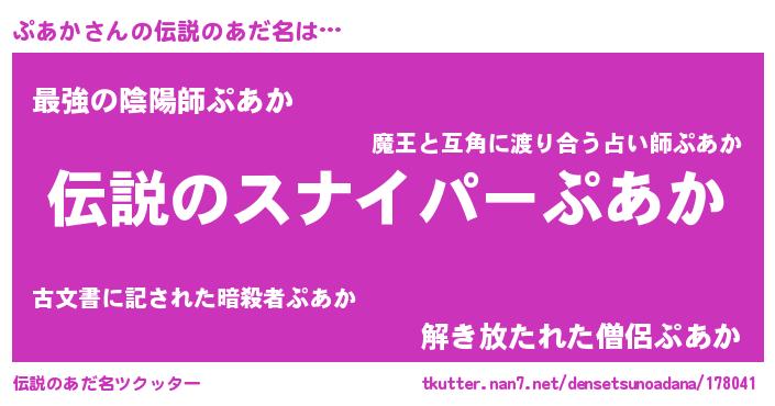 | 男性向けラノベタイトル風あだ名 | 『ぷあかの憂鬱』『はたらくぷあかさま!』 |