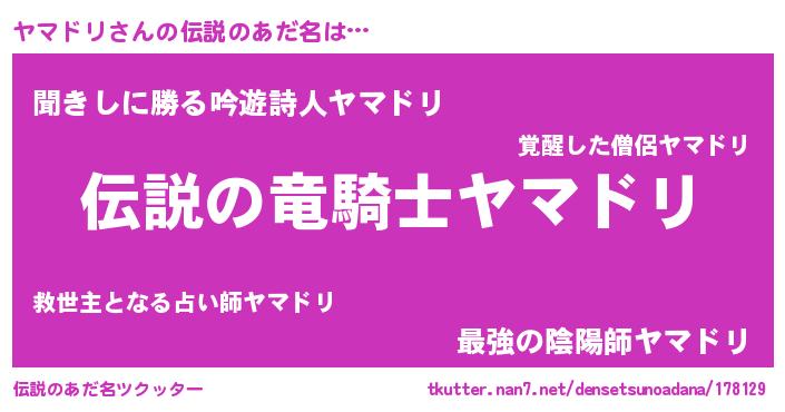 | 男性向けラノベタイトル風あだ名 | 『ヤマドリの憂鬱』『緋弾のヤマドリ』 |