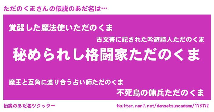 | 意味不明あだ名 | 『自称ただのくま』『ニラ科ただのくま属』 |