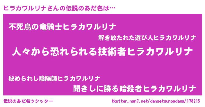 | 男性向けラノベタイトル風あだ名 | 『ヒラカワルリナスレイヤー』 |