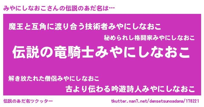 | ヘコむあだ名 | 『みやふぇ~』『みやにしなおこ(小並感)』 |