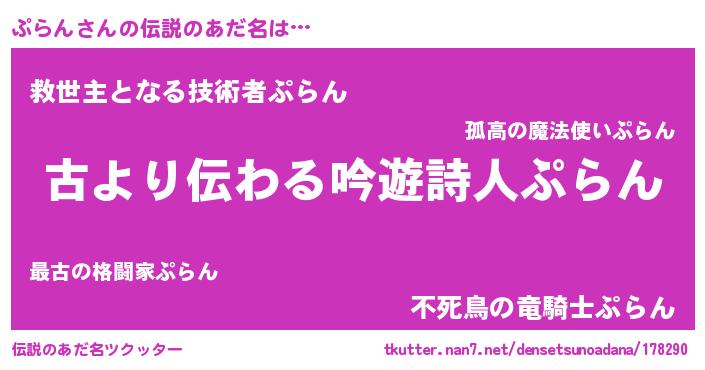 | 男性向けラノベタイトル風あだ名 | 『ぷらんという概念が存在しない退屈な世界 』 |