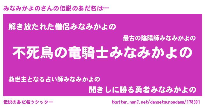 | ヒーロー風カッコイイあだ名 | 『スーパーミナミカヨノ』『天弓騎士ミナ』 |