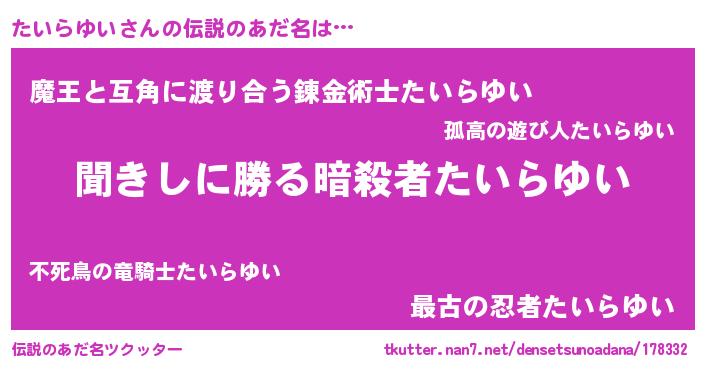 | 胡散臭い通販商品みたいなあだ名 | 『絶対に幸福をもたらす健康食品…その名も「たいらゆい」』 |