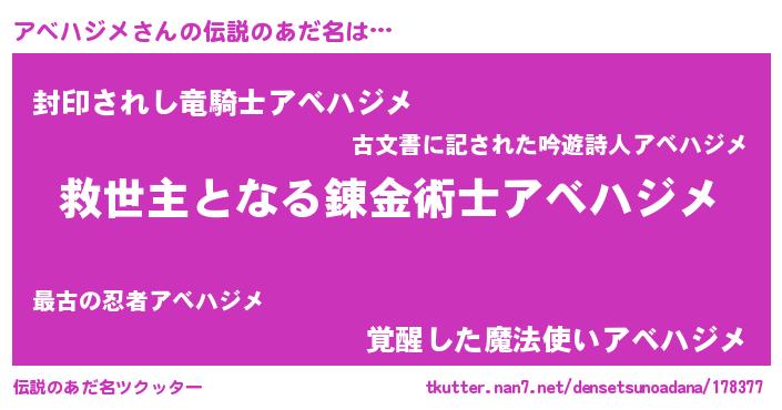 | 男性向けラノベタイトル風あだ名 | 『ノーゲーム・ノーアベハジメ』 |