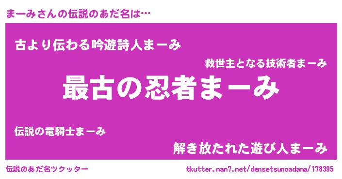 | 男性向けラノベタイトル風あだ名 | 『うちの娘の為ならば、俺はもしかしたらまーみも倒せるかもしれない。』 |